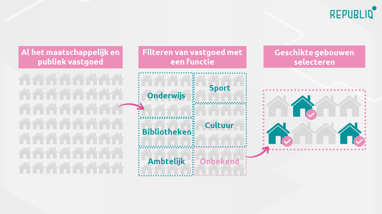 Op basis van open data en data van Republiq is al het publiek en maatschappelijk vastgoed in deelnemende gemeenten in kaart gebracht. Hiervoor maakten we onder andere gebruik van Benchmark Gemeentelijk Vastgoed. De gebouwen waarvan de functie en het gebruik onbekend zijn, zijn bestempeld als potentieel geschikt. Gemeenten zijn vervolgens gevraagd deze gebouwen te valideren en de gebouwgegevens te verrijken.