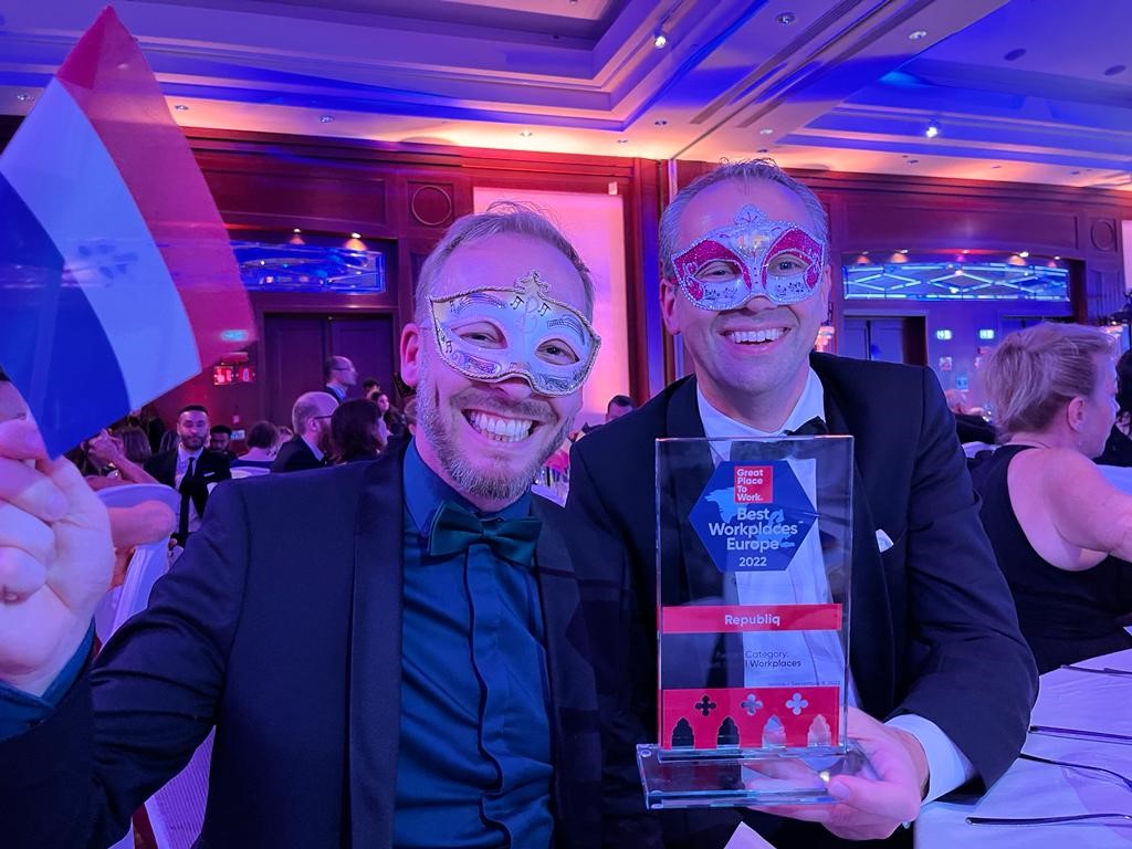 Onze oprichters Peter Korst en Marten Middendorp werden door Great Place to Work uitgenodigd voor de uitreiking van Best Workplaces Europe in Venetië. Daar kregen ze in stijl (deze foto konden we jullie niet onthouden) te horen dat Republiq in de categorie ‘Small’ op de 9e plaats is geëindigd. En met deze unieke plek zijn we hartstikke blij.